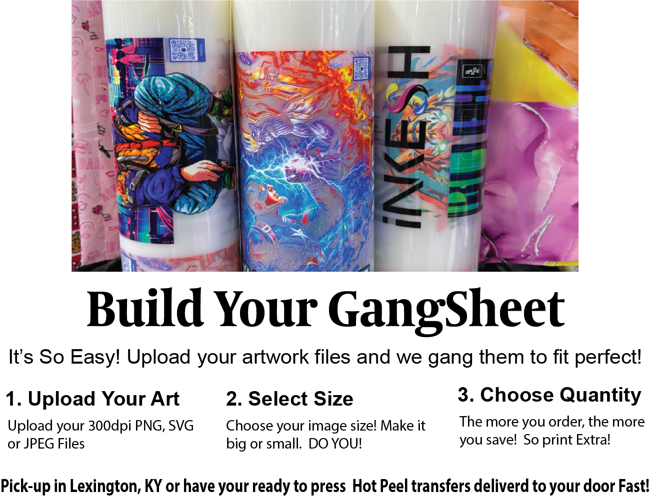 Ready To Press Hot Peel Transfers Automatically Gang-Sheeted For You.